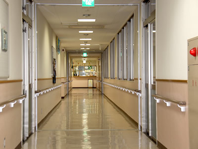 移動に車椅子が必要な方も安心なバリアフリー設計の広い廊下になっています。大きな窓から差し込む光が四季を感じさせ、心地よい生活を演出します。